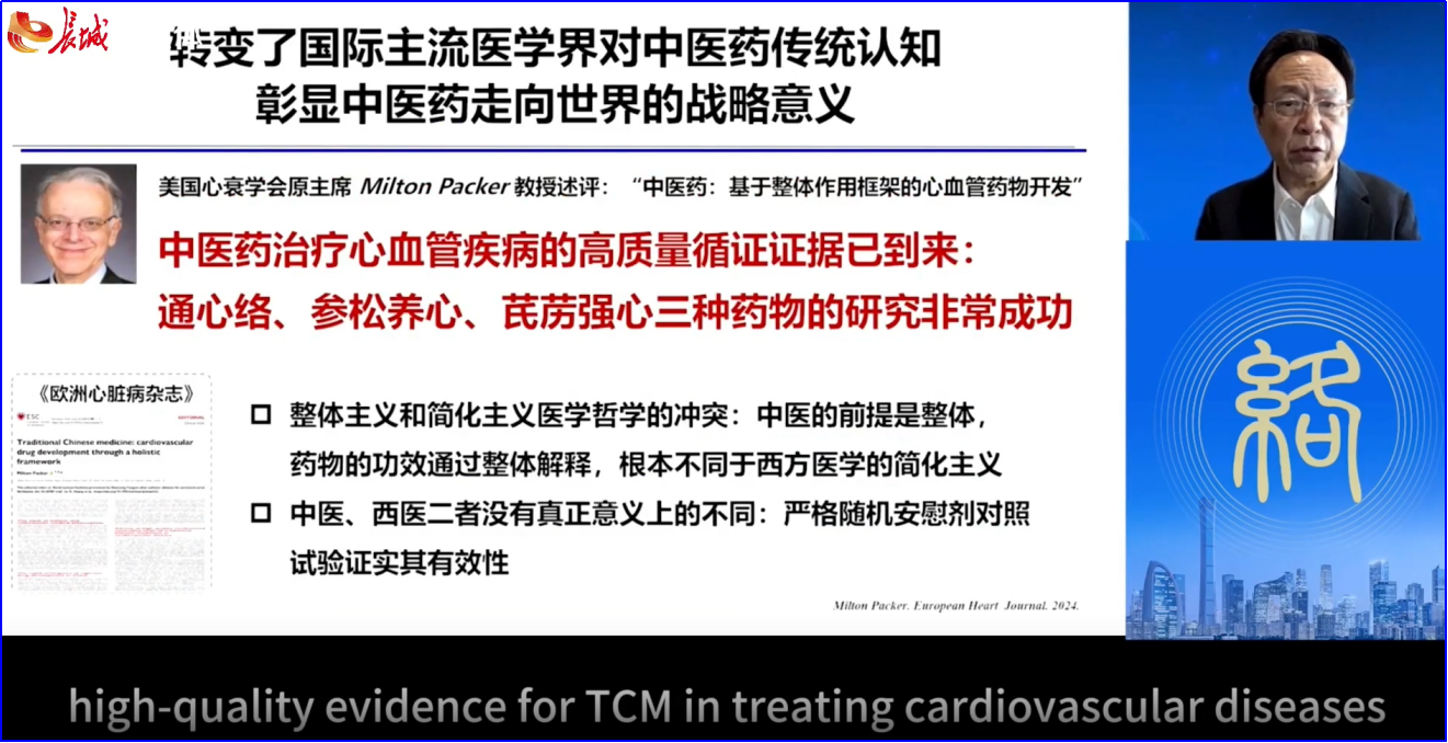 在学术主旨报告环节,中国工程院院士吴以岭教授线上参会,并作题为《络病理论体系构建与创新转化》的学术报告。他重点分享了络病理论创新转化成果以及脉络学说指导血管病变防治,气络学说指导神经、内分泌、免疫系统疾病防治,气络学说精神气理论指导抗衰老研究取得的最新科研突破,引发了海内外与会专家的反响。